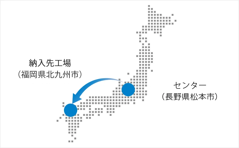 長野県松本市(センター)から福岡県北九州市(工場納入)までの長距離輸送をトラック輸送で行うことを検討していたが、松本市~南松本駅、及び、北九州駅~工場の短距離をトラック輸送に、南松本駅~北九州駅までの長距離は鉄道輸送に切り替えることによって、CO2排出量の削減を実現しました。