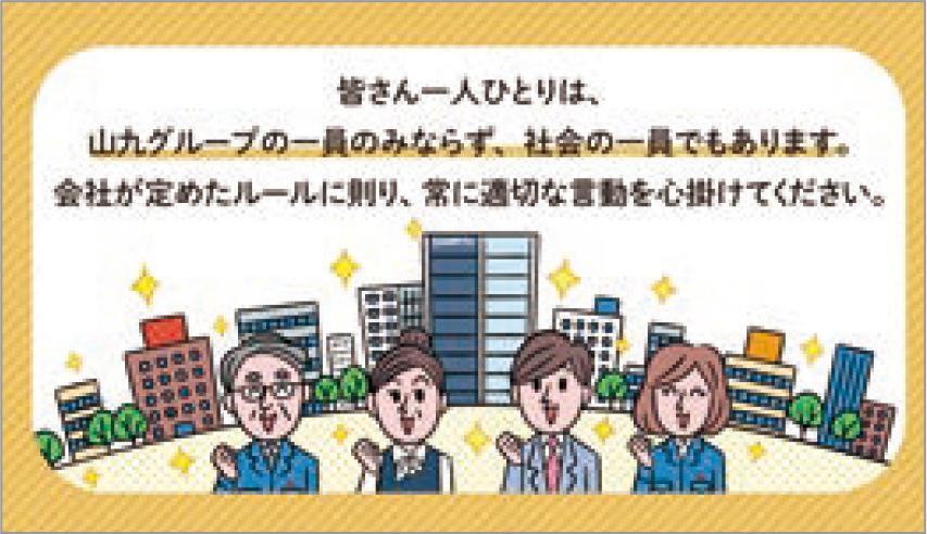 コンプライアンス意識の向上を図るため、「誰もが理解できる倫理規程」、「当社グループで実際に発生した事例をもとにしたパワハラ、不正取引、個人犯罪」のイラスト動画コンテンツを作成し、イントラネットを通じて全社員に配信しました。また、管理職向けの「コンプライアンス推進の心得」、全社員向けの「コンプライアンスハンドブック」も配布しており、各職場でのコンプライアンス教育等で活用しています。