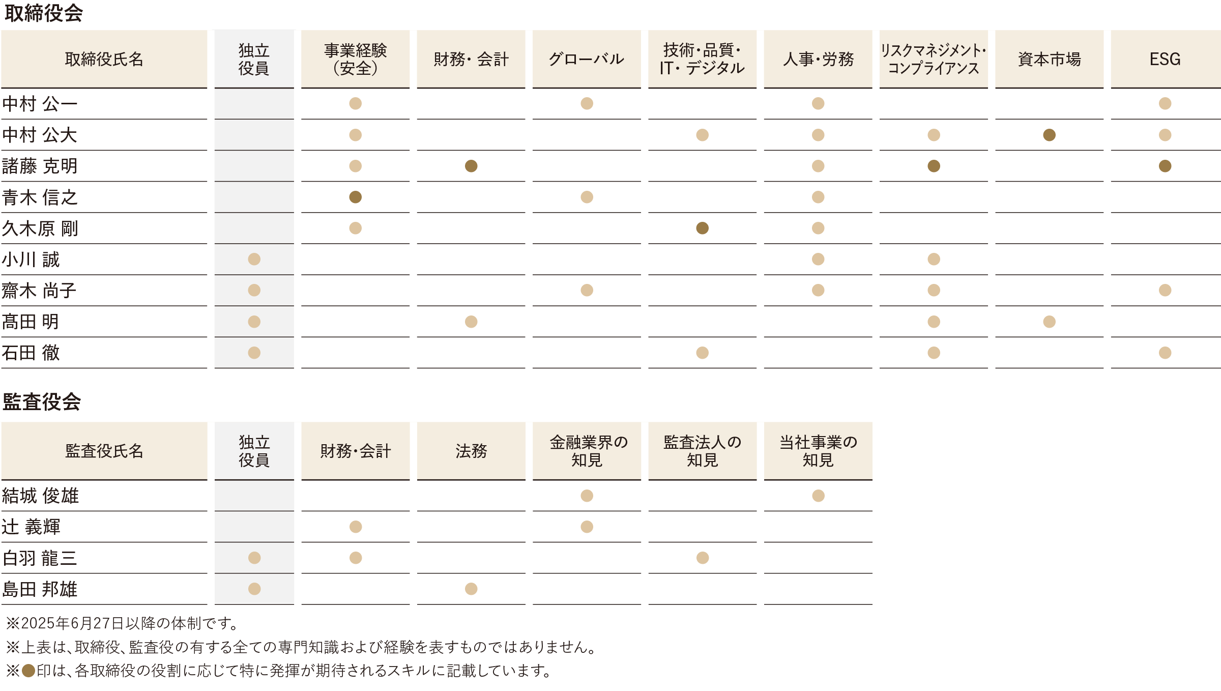 当社の取締役会および監査役会は、期待されるスキル(専門知識・経験)に加え、高い倫理観、公正さ、誠実さ等を備えた多様な役員にて構成されており、取締役の指名においては指名委員会にて必要となるスキルや構成について審議しています。