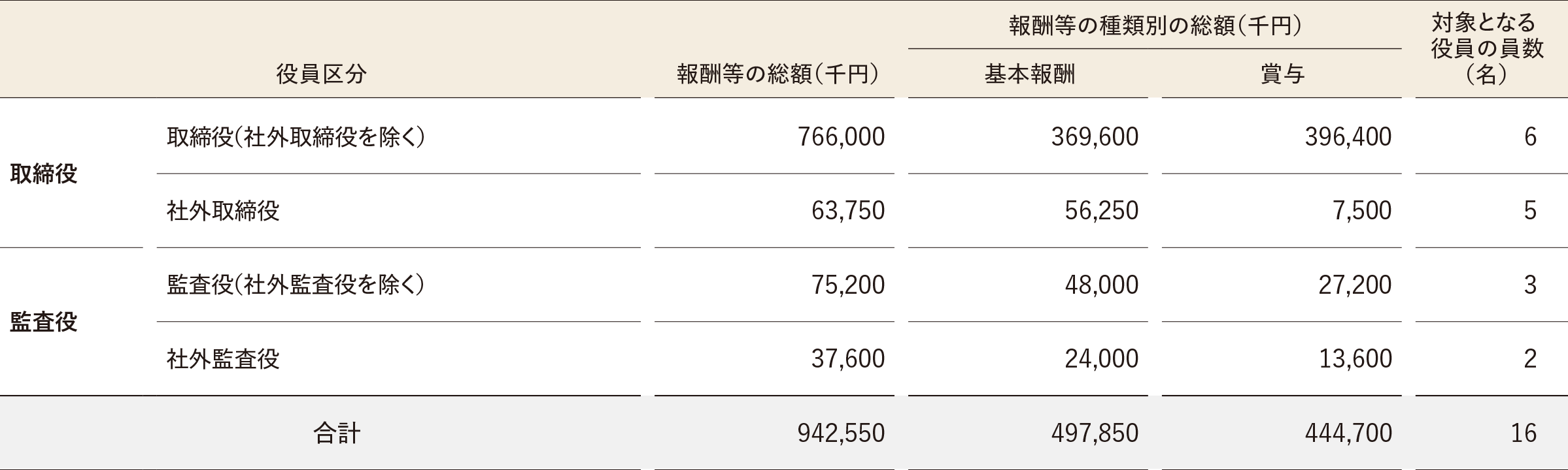 役員区分ごとの報酬等の総額、報酬等の種類別の総額および対象となる役員の員数 (2024年度)